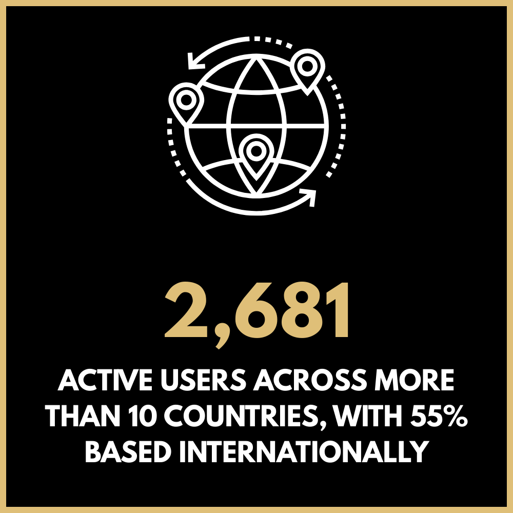 In our first quarter since launch, the platform has grown to 2,681 active users across more than 10 countries, with 55% based internationally. During this quarter alone, 2,597 new users joined.